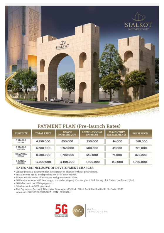 The launching price of 5 Marla plots is 42.50 lacs. The booking + confirmation amount of the plot is 8.50 lacs only. Moreover, there are 35 monthly installments and semi-annual installments (6). As well as the possession amount is 3.25 lacs only.